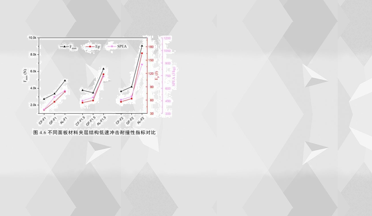 為了更為直觀地比較不同面板材料的夾層結(jié)構(gòu)的抗沖擊性能,圖4.6比較了相同面板厚度但面板材料不同的夾層結(jié)構(gòu)的耐撞性指標(biāo),通過比較可以看出,鋁合金夾層結(jié)構(gòu)有最優(yōu)的耐撞性能,其臨界穿透能高達(dá)118J,初始峰值載荷高達(dá)6297N;而碳纖維增強(qiáng)夾層結(jié)構(gòu)的耐沖擊性能明顯低于鋁合金夾層結(jié)構(gòu)的,其臨界穿透能和初始峰值載荷分別為54J和3752N;而與碳纖維增強(qiáng)夾層結(jié)構(gòu)相比,玻璃纖維的耐碰撞性略有提高,其臨界穿透能為59J。此外,根據(jù)三者完全穿透試件的載荷-位移在第一階段的斜率可以看出,如圖4.5(d),鋁合金夾層結(jié)構(gòu)的斜率最大,也就是說,在低速?zèng)_擊工況下,鋁合金夾層結(jié)構(gòu)的剛度大于纖維增強(qiáng)夾層結(jié)構(gòu)的剛度。通過觀察面板厚度為1mm和2mm試件的耐撞性指標(biāo),也可以知道,在低速?zèng)_擊工況下,鋁合金夾層結(jié)構(gòu)有最好的耐撞性能,而碳纖維夾層結(jié)構(gòu)的耐撞性能在三者幾乎是最差的。