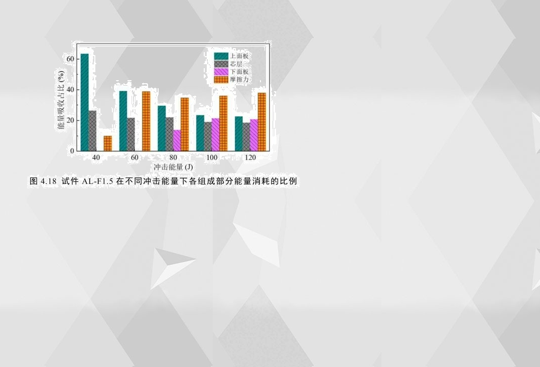 圖4.18為AL-F1.5在不同沖擊能量下各組成部分能量吸收的比例。上面板消耗的能量比例在小能量(40J)沖擊下最大(高達(dá)64%),芯層耗能占比為26.5%,因此在小能量沖擊下,增強上面板和芯層的防護(hù)更能提高結(jié)構(gòu)的耐沖擊性能;當(dāng)下面板完全穿透時,摩擦力消耗的能量占比最高(約為38%);有趣的是,在各沖擊能量下,泡沫芯層吸能占比均在20%左右;此外還發(fā)現(xiàn),無論夾層結(jié)構(gòu)穿透與否,上面板的耗能占比均大于下面板,這說明增強上面板更能提高夾層結(jié)構(gòu)的耐沖擊性。